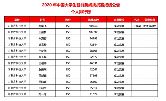 2020年8月,在betway西汉姆联官网(足球学院)的组织下,我校学生参加了2020年全国大学生智能跳绳线上挑战赛并取得优异成绩。本次比赛是在疫情防控常态化的特殊时期展开的为期15天的线上比赛,旨在恢复和增强大学生的体质健康,提高大学生体育锻炼意识,调动大学生参与体育活动的积极性。