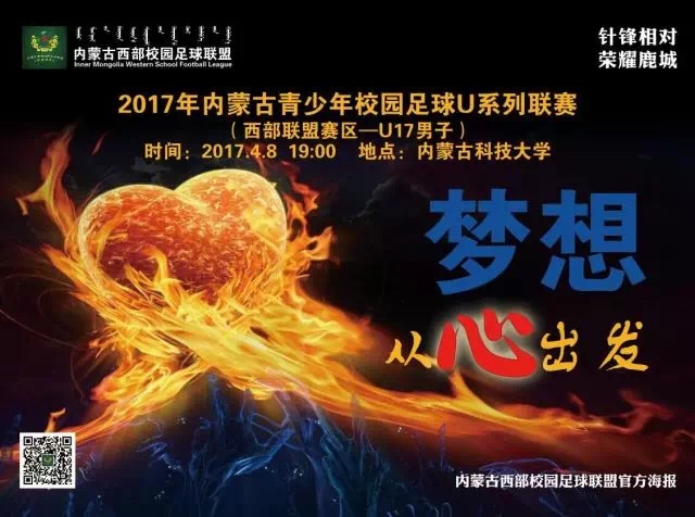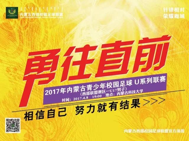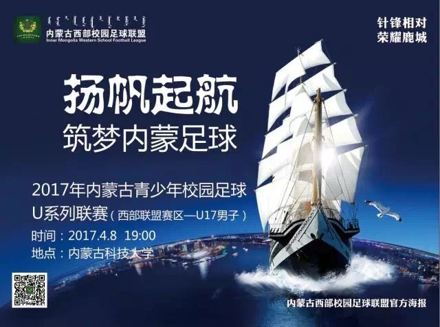 4月8日19:00分,2017年内蒙古自治区校园足球“西部联盟杯”校园足球联赛(U17男子组)揭幕战将在betway西汉姆联官网主校区体育场举行,对阵双方由包头市主场迎战巴彦淖尔市。本次比赛由内蒙古自治区校园足球工作领导小组办公室主办,内蒙古西部校园足球联盟、包头市教育局、乌海市教育局、巴彦淖尔市教育局、阿拉善盟教体局承办,内蒙古自治区中学生体育协会、内蒙古校园足球联合会协办。
