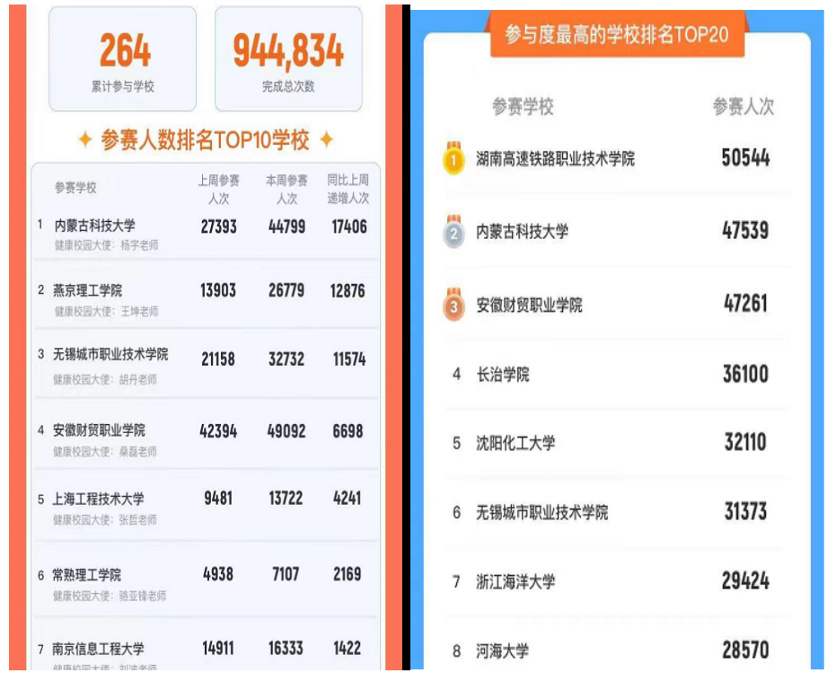 在我校师生的共同努力下,累计参赛人数达到10482人,共计完成比赛249762次,我校在全国参赛的高校中排名第五,省内排名第一,单日最高参加人数达到7723人。