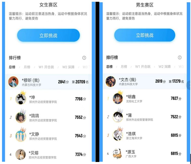 经过不懈努力,我校共有6381名同学完成比赛并获得证书,348名同学进入全国TOP榜,同学们参赛的积极性明显提升,从开始的一周参与2次提升到一周参与6次,同学们各项体能训练动作完成度、标准度显著提高。