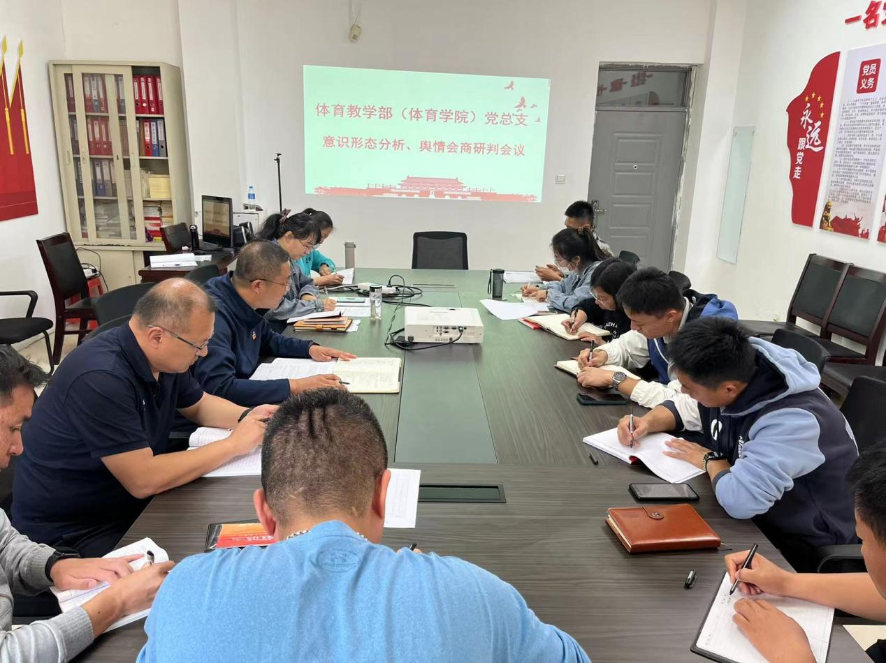 9月21日,betway西汉姆联官网党总支在体育馆一楼会议室召开意识形态分析、舆情会商研判会议,学院党总支书记苗凯主持会议,科级以上领导干部参会。