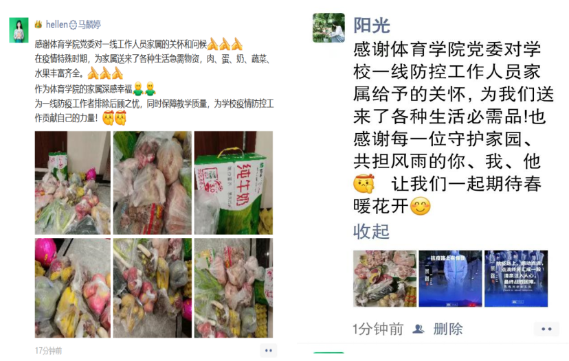 自本轮疫情发生以来,betway西汉姆联官网第一批住校教师及工作人员已连续工作近20天,在当前疫情防控的紧张形势下,学院党委以线上配送的方式,分别对抗疫一线工作人员家属进行了慰问,为他们送去了牛奶、鸡蛋、肉类、蔬菜、水果等慰问品。