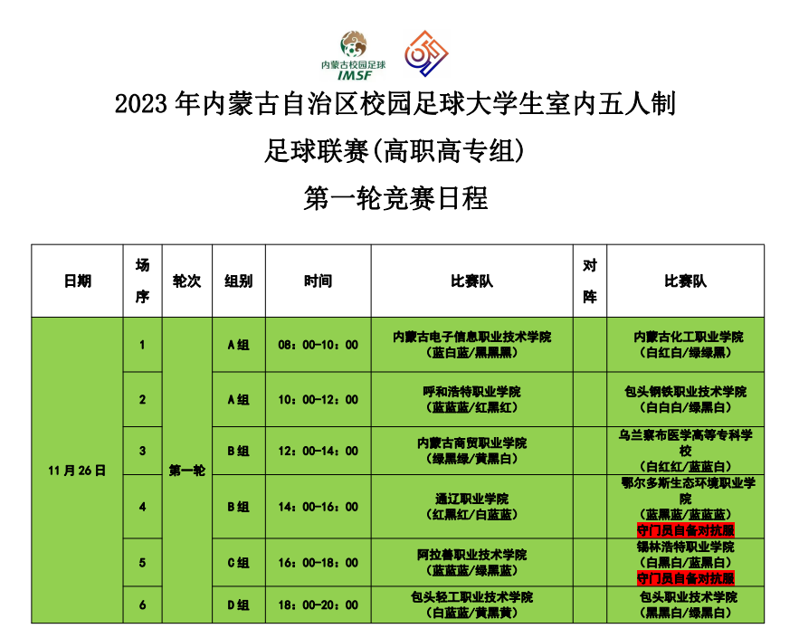 本次第一阶段比赛为高职高专组室内五人制足球赛,比赛时间为11月26日至12月1日,来自内蒙古自治区14所学校组成的足球代表队参赛,参赛人数233人。