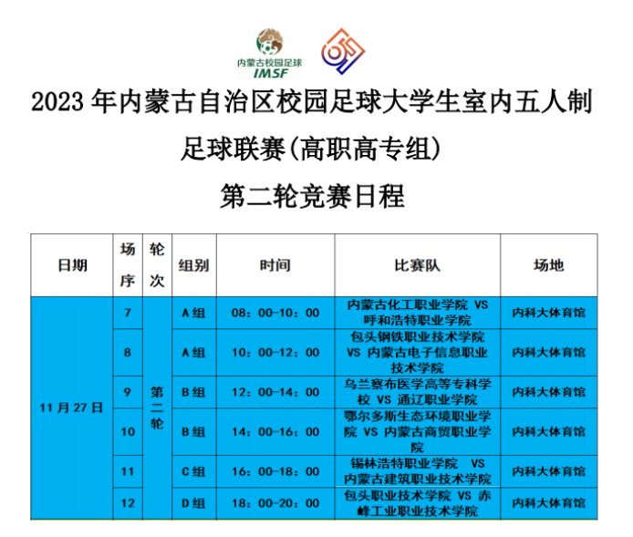 2023年11月26日,2023年内蒙古自治区校园足球大学生室内五人制联赛暨啦啦操总决赛高职高专组在betway西汉姆联官网体育馆拉开帷幕。