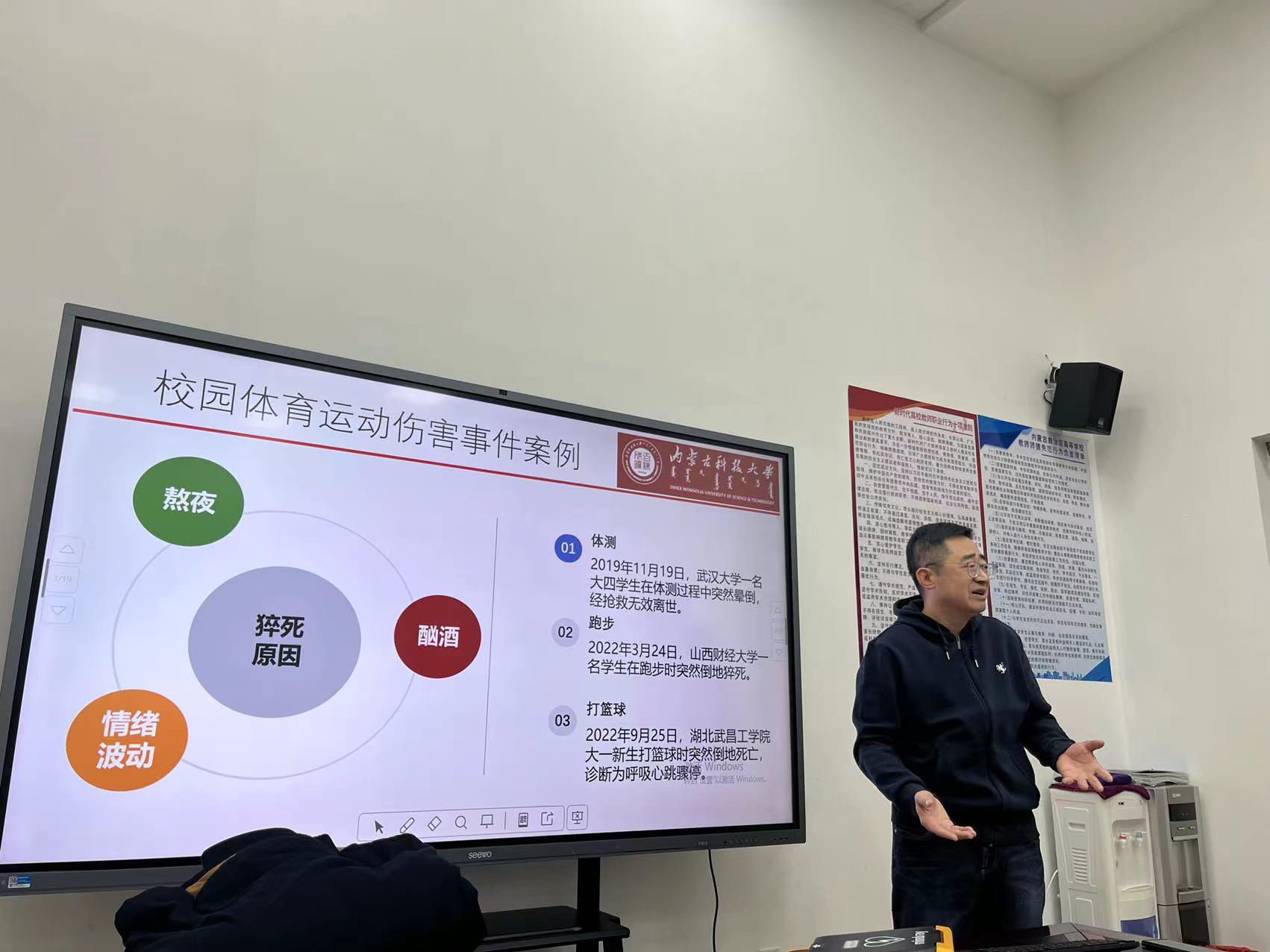 针对体育课程的特殊性,会上邀请校医院左强博士为全体任课教师开展了“体育教学安全第一课”。