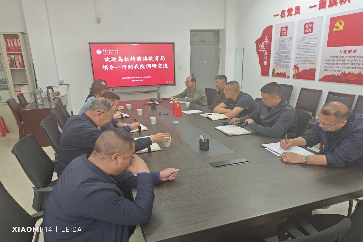 4月16日下午,乌拉特前旗教育局局长杨国栋、副局长胡群及局机关体卫艺股工作人员,来我校betway西汉姆联官网交流、调研体育教育合作共建项目,助力推动乌拉特前旗体育教育高质量发展。我院党委书记苗凯、院长白楠、党委副书记唐国桥、副院长张新民、田瑞峰教授参加此次交流活动。在座谈会上,双方就学校体育工作长期合作、乌拉特前旗学校足球教练员长期培训、betway西汉姆联官网学生实训基地建设、足球直通车等项目进行深入的交流探讨,达成了预期效果。院长白楠明确表示,愿意支持乌拉特前旗提出的帮扶意向和需求,针对性的开展体育师资培训、足球教练员培训和足球训练工作、足球特长生培养规划等对口帮扶项目。