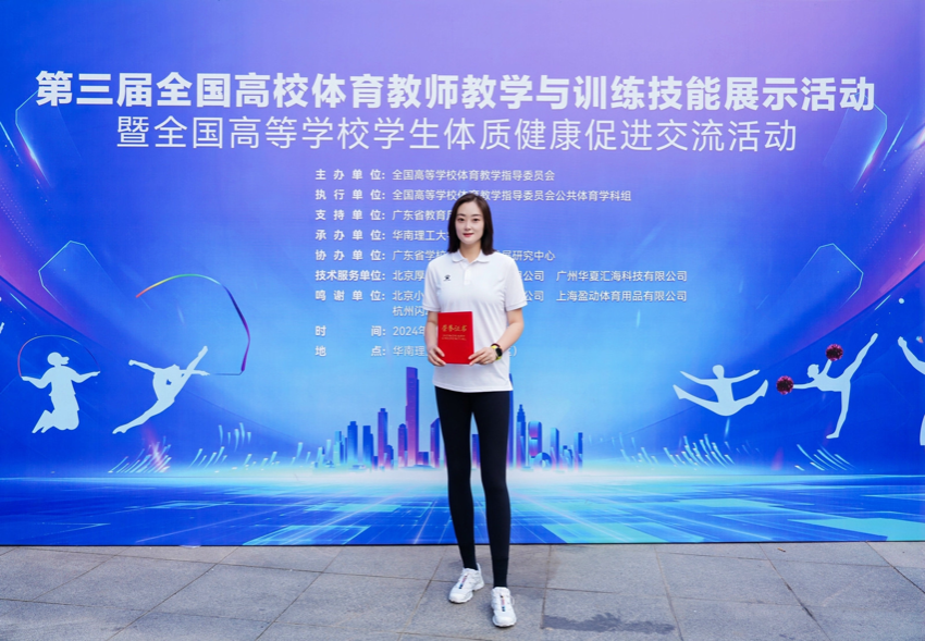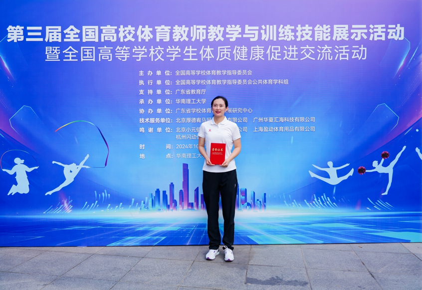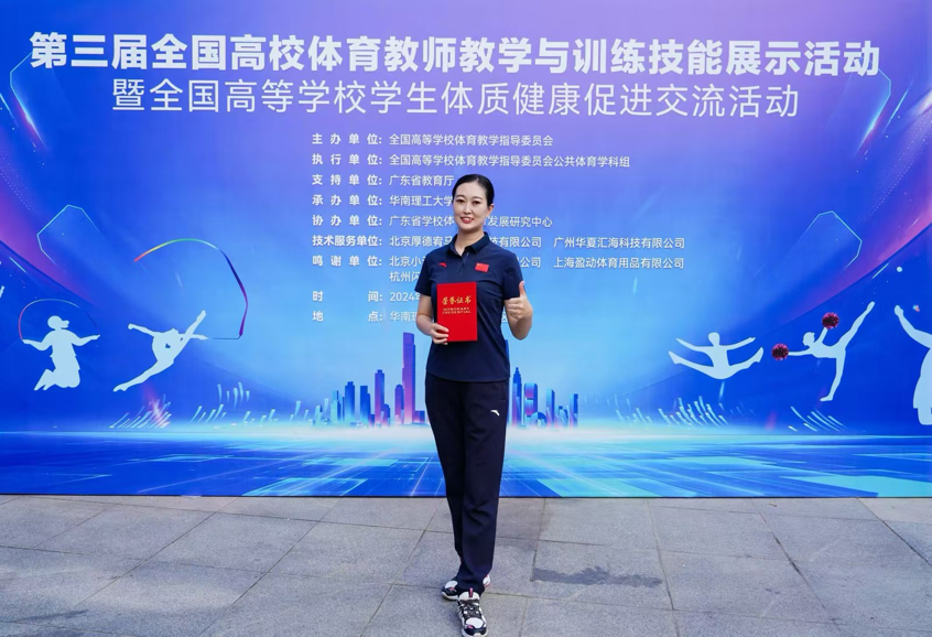 2024年10月11日,第三届全国高校体育教师教学与训练技能展示活动在华南理工大学举行,本次比赛由全国高等学校体育教学指导委员会主办,共有来自全国14个省市自治区的103所知名高等院校的214名体育教师,我校作为教指委公体组委员学校选拔推荐3名教师参赛。经过激烈角逐,陈中华老师荣获羽毛球中年组一等奖、孙耀兰老师荣获排球青年组一等奖、宋萌老师荣获操舞类中年组三等奖。
