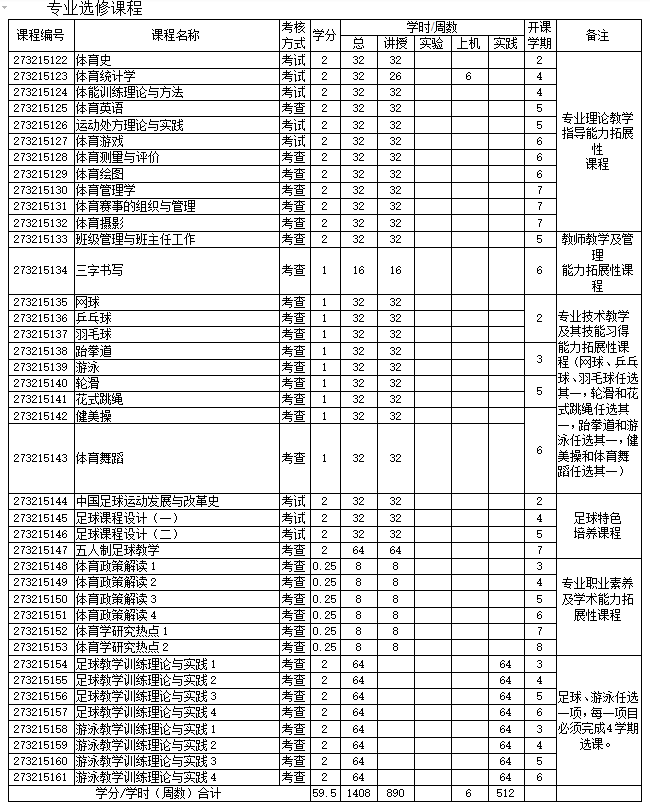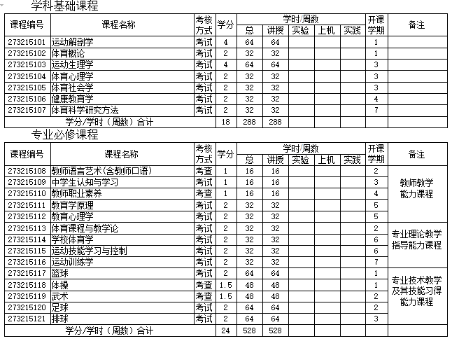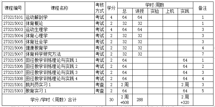2、主要实践环节:裁判员实习(1、2)、教育实习(1、2)、田径教学训练理论与实践(1-4)、毕业实习、毕业设计(论文)