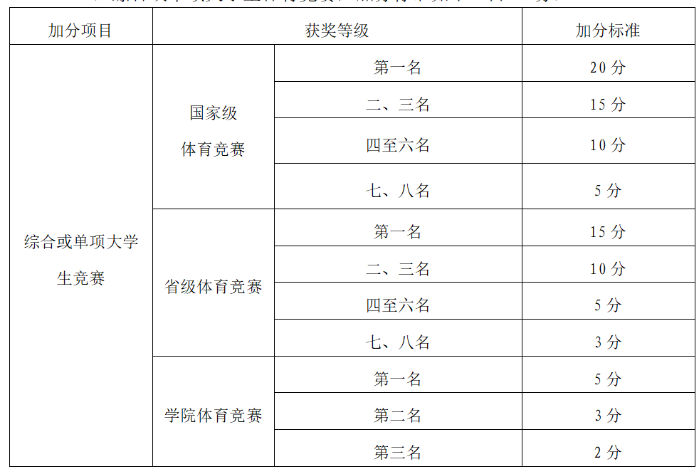 (1)综合或单项大学生体育竞赛,加分标准如下(占20分):