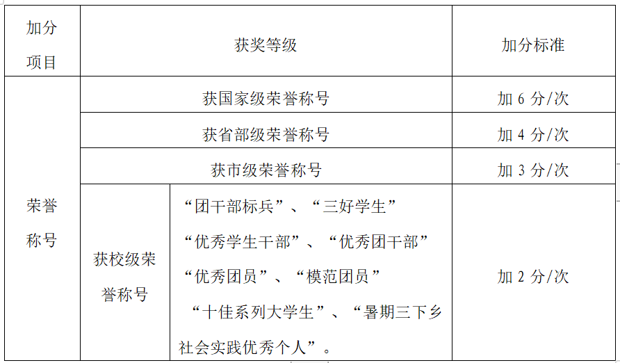 【备注】校级荣誉称号指以上表格所列内容。奖学金所获荣誉称号不予加分。